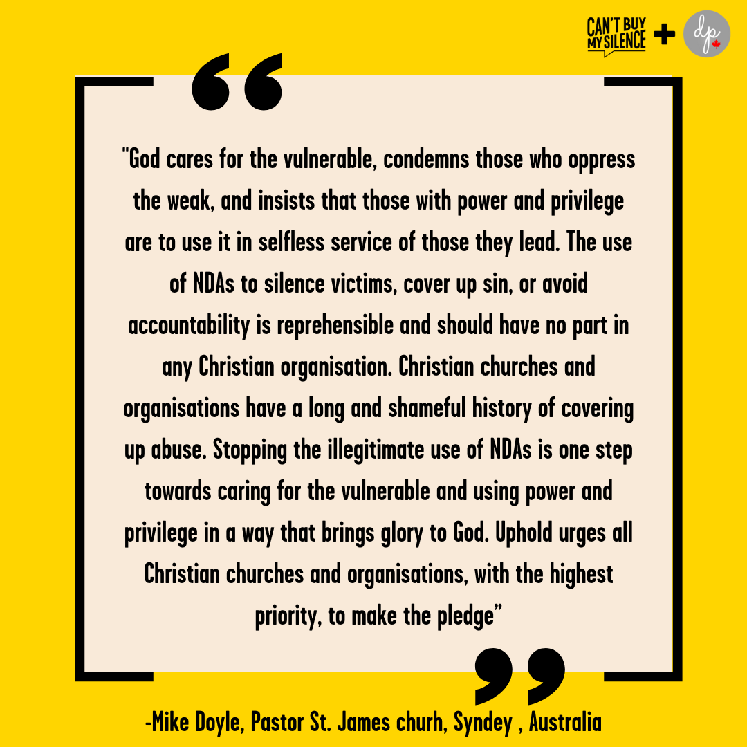Governments and organizations around the world are rapidly taking steps to abolish the misuse of NDAs. In the USA President Biden signed into law the Speak Out Act which prohibits the use of pre dispute NDAs and non disparagement agreements in cases of sexual misconduct. In Ireland the Employment Equality (Amendment) Bill 2021, which prohibits the use of NDAs in instances of abuse and harassment in the workplace, became law in October 2024. By committing to the Pledge, you will bring your faith-based organization in line with the legal reform that is already underway across the world. It will make you a leader in Canada, signaling to your shareholders and employees that you take workplace ethics seriously.